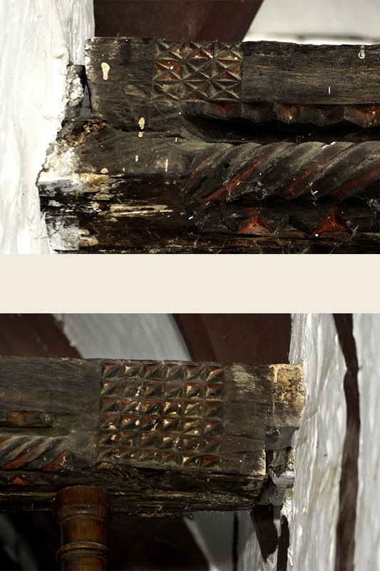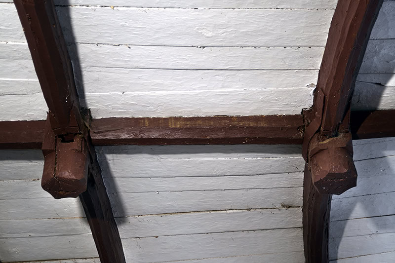 En medio de esta estructura asoman dos gruesos tirantes asegurados mediante sendos pendolones (uno de ellos ha precisado de otro reforzamiento auxiliar a base de chapas de hierro; lo mismo ha sucedido en otros puntos de la bóveda). Se decoran con aparatosas zapatas de motivos vegetales [13].