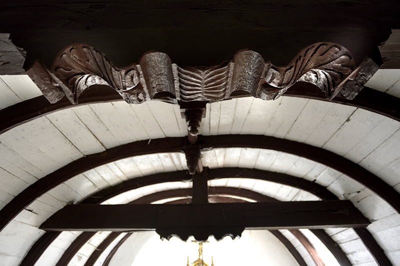 En la nave se repite el cañón, pero esta vez de madera. Se fragmenta por once fajones formados por pares curvos que convergen en unas claves centrales. En el punto de unión con éstas se tallan unos picos [10] habituales en las carpinterías del País Vasco durante la primera mitad del siglo XVI2SANTANA EZKERRA, 1996, passim. SANTANA EZKERRA y BARRIO LOZA, 1996, passim.. Los fajones, de perfil adelgazado a base de rebajes cóncavos, se embuten en el muro en su parte inferior, asegurando su apoyo. Sobre estos nervios se fija la tabla que cierra la bóveda.