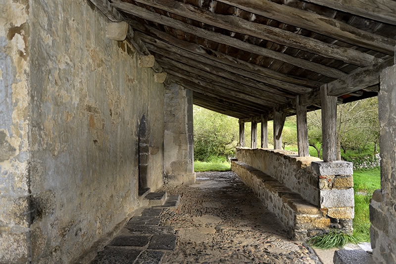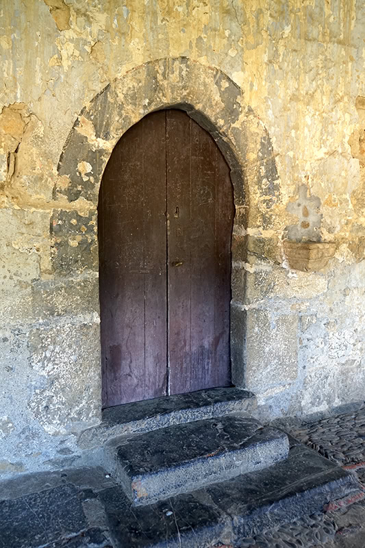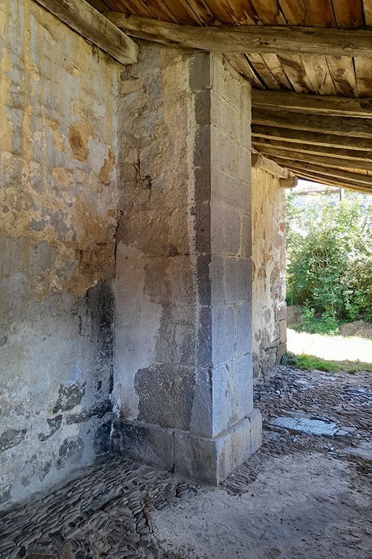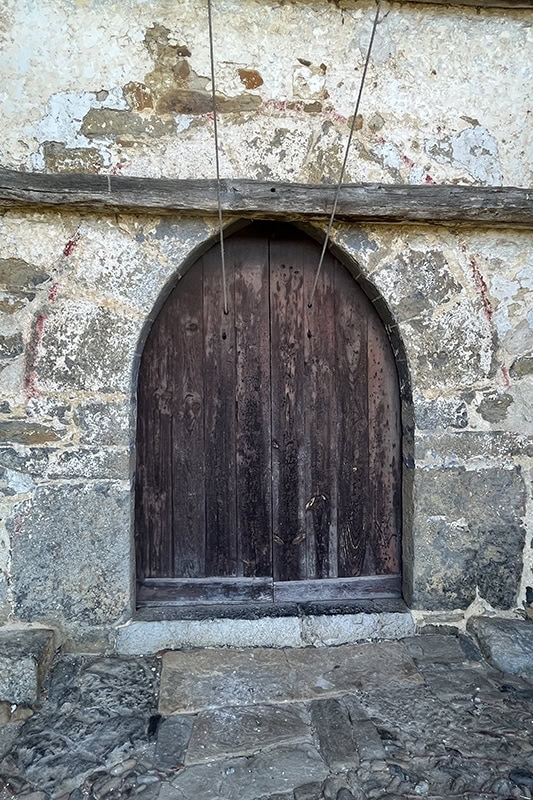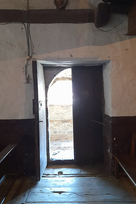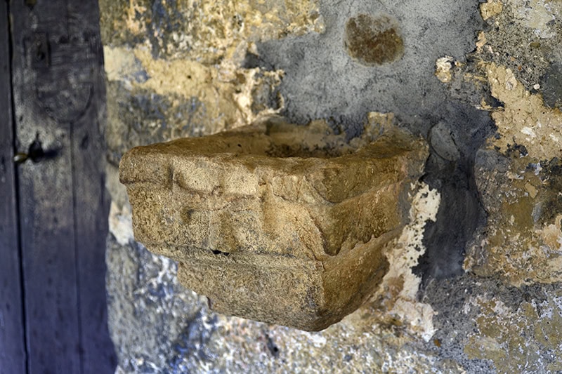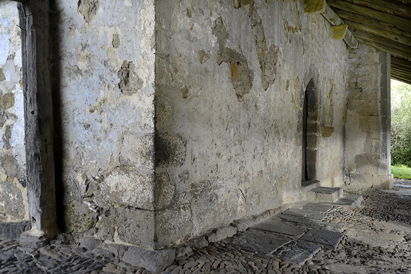 En el muro sur se abre el otro acceso [20], también de nueve dovelas apenas perceptibles a causa del revoco. Su túnel [21] se adintela en madera con la arista biselada. A su lado aguabenditera [22] muy erosionada, de sección cuadrada y perfil mixtilíneo, decorada con una cruz patada al frente, acaso del siglo XVII.