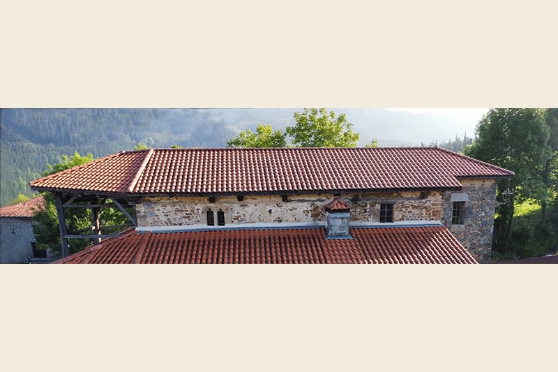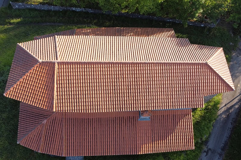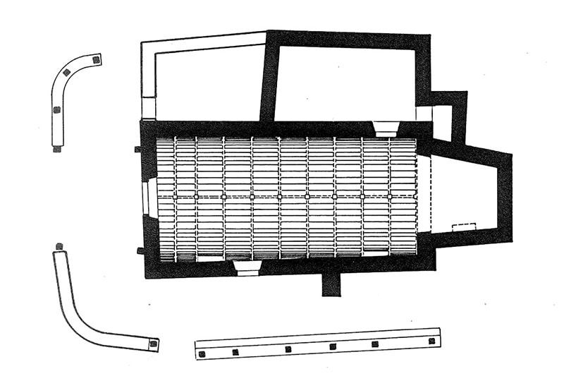 El tejado [15] es a cuatro aguas con una larga cumbrera corrida a lo largo de toda la nave.