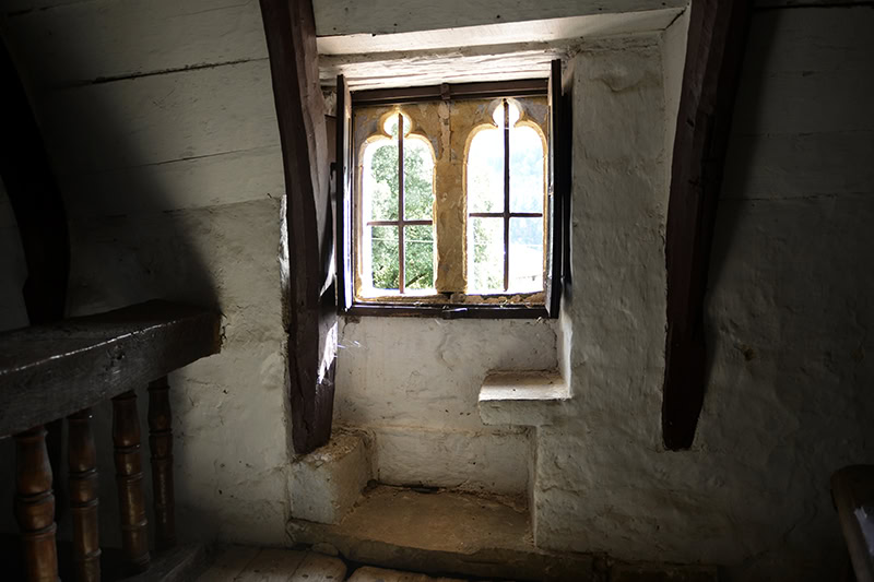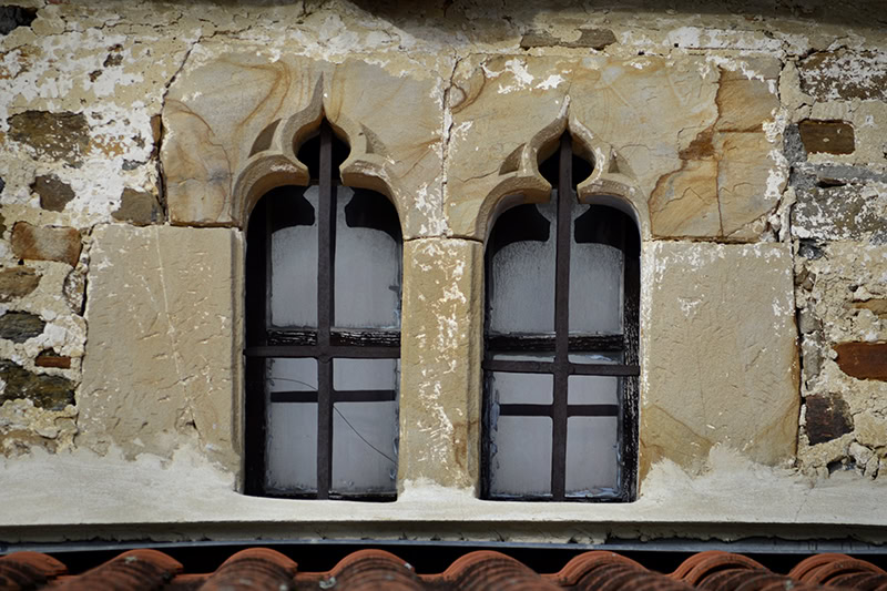 Más interesante es el vano de asiento abierto al coro [17]: geminado de dos vanos trilobulados con aristas naceladas, de muy fina ejecución [18]. Curiosamente cuenta con un único asiento, en lugar de la habitual pareja, y su interior se adintela en madera. Estas particularidades parecen responder a la singular biografía del edificio, como veremos.