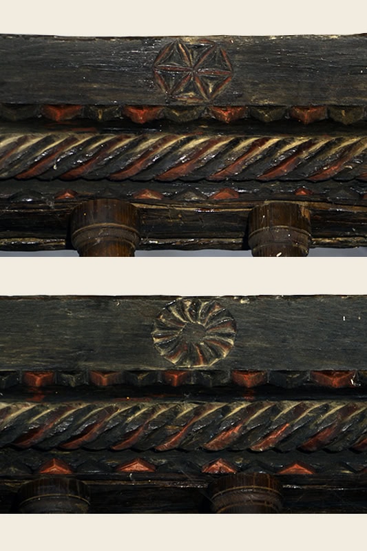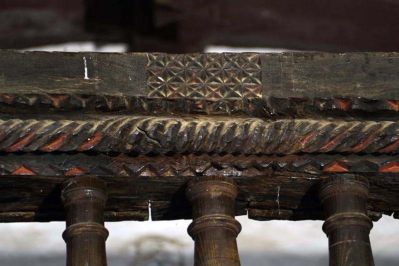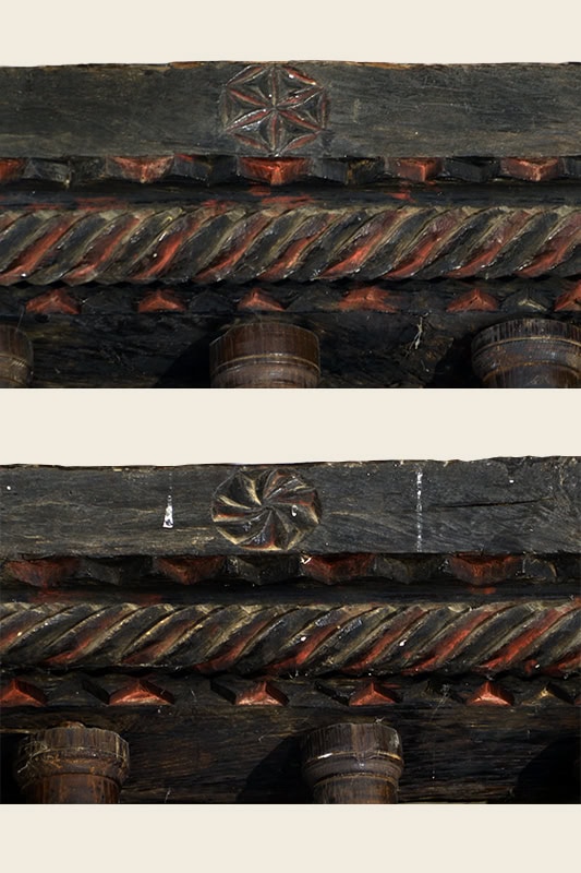El coro [23], en madera, es un elemento popular pero muy cuidado. Profundo, ocupa casi los cuatro últimos tramos de la nave. Descansa la estructura en una viga carrera, una sólida pieza que en los extremos se ha tallado creando una ficción de mensulillas con las cabezas decoradas con costillas agudas [24]. Sobre ella las viguetas secundarias, muy próximas unas a otras, repiten la decoración, aunque más ancha. En una nueva carrera, moldurada en filetes y cuarto de bocel, se ajustan los balaustres, torneados, que a su vez sirven de apoyo al pasamanos. Éste es complejo decorativamente: una hilera de dientes de sierra, un cordón torso, nueva hilada de dientes y, en el frente, cuatro rosetas [25] [26] y tres paneles para grupos de aspas excavadas a bisel [27] [28]. En toda esta ornamentación aparecen restos de policromía roja y negra3SANTANA EZKERRA y BARRIO LOZA, 1996, 243-244..