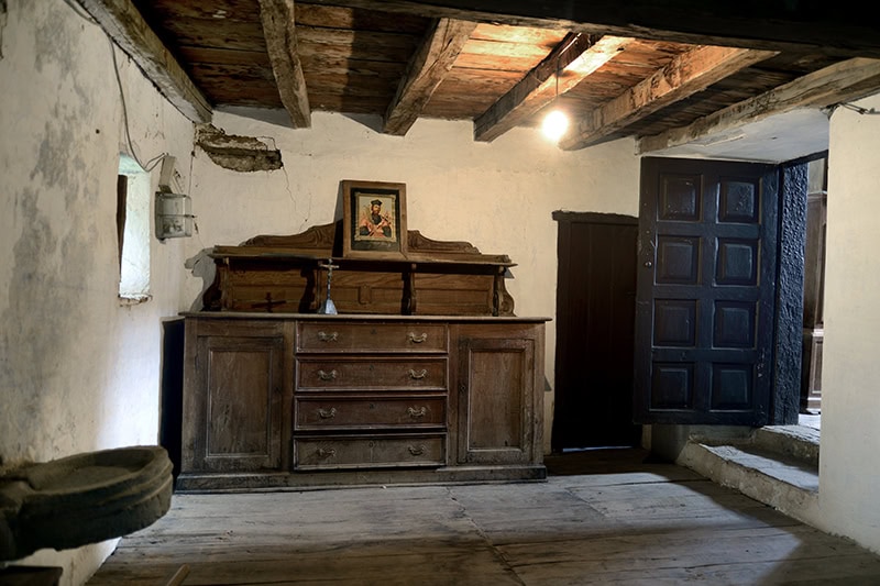 La sacristía [29] se comunica con la nave al lado evangelio a través de una puerta con marco de madera. Es de dos tramos, definidos por una viga central en el techo decorada con mensulillas molduradas [30]. Se ilumina por dos ventanas, una de ellas cerrada con barrotes de pera [31], la otra torpemente ampliada en 19115AHEB-BEHA, Parroquias de San Lorenzo Mártir y Santa María de Orozko – Urigoiti – Zaloa, Cuentas 1897-1956, sign. 3006/001-00.. Se completa con un habitáculo reciente, hacia levante, para aseo.