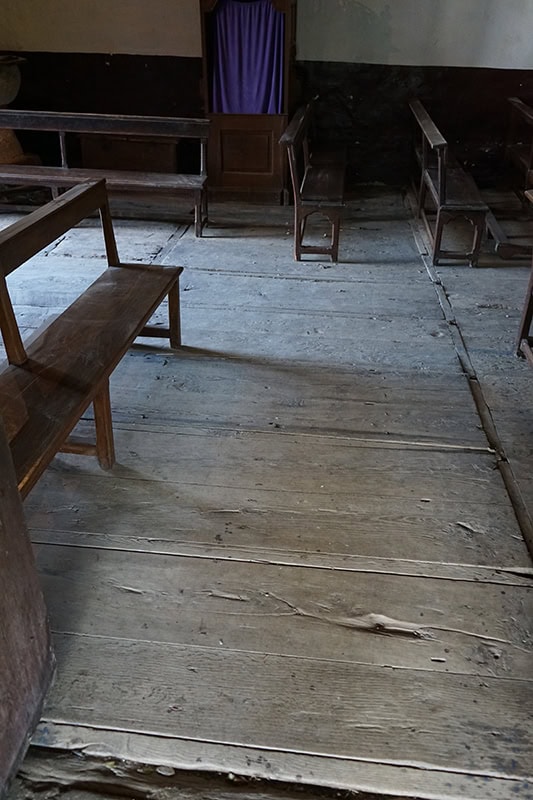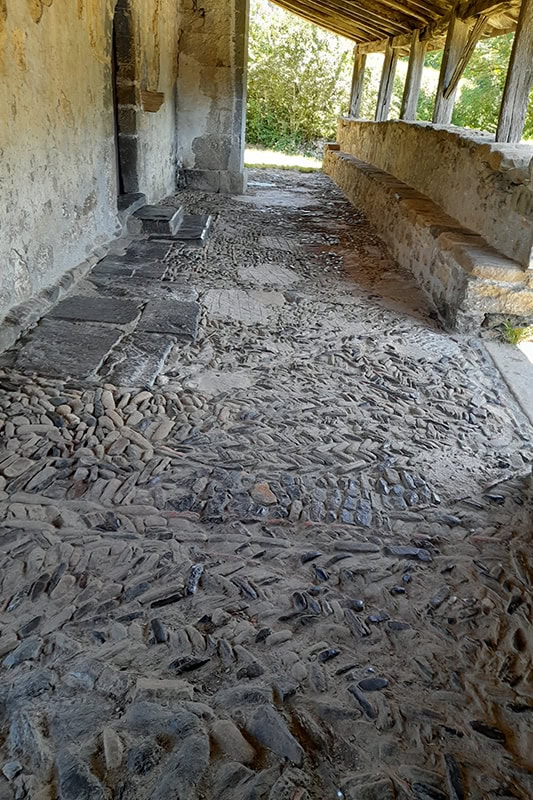 El pavimento es de madera, algo sobre elevado en los dos primeros tramos y más aún en la cabecera. Aunque el piso ha sido parcialmente repuesto, en algunas zonas aún conserva [8] anchos tablones cortados a azuela y zonas de encajonadura de sepulturas. Al menos ésta parece fruto de alguna reforma del siglo XIX.