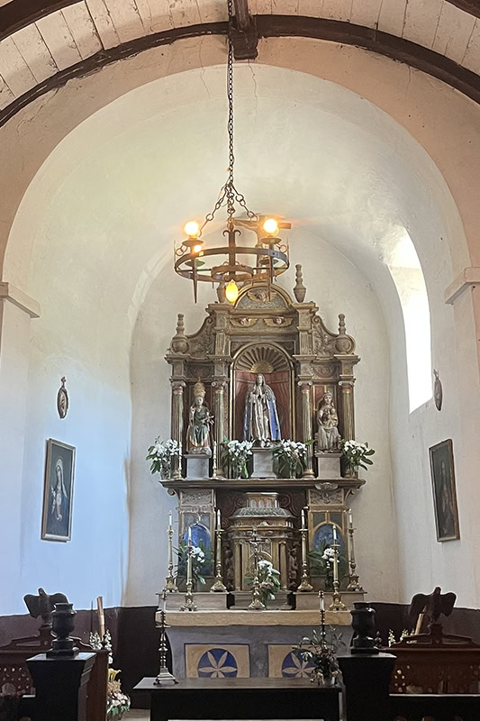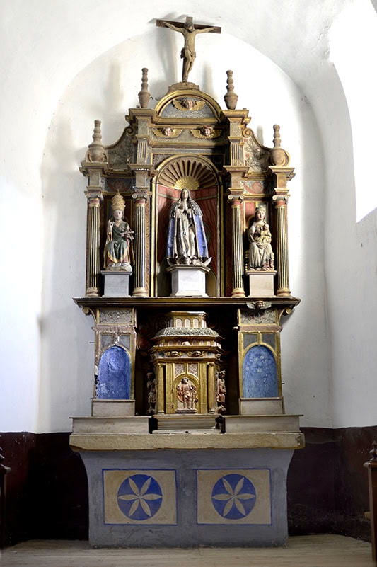 Retablo [35] de tres calles, mucho más ancha la central, con un alto bancal y un cuerpo rematado en un mínimo ático. Madera parcialmente dorada y policromada en rojo, azul y marrón, y con abundantes pinturas figurativas y geométricas bastante torpes.