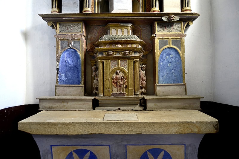 La mesa de altar es un rústico podio de aristas cóncavas pincelado al frente con unas rosetyas, motivo muy popular que imita los trabajos del pasamanos del coro.