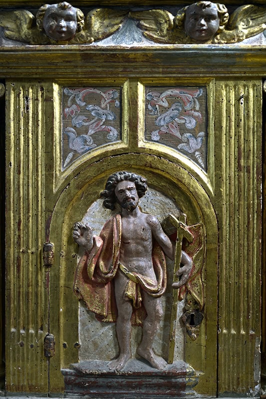 Al centro va el sagrario, una compleja estructura cúbica con los planos marcados por columnas jónicas. En la puerta lleva relieve del Salvador [37] (28 x 20), acogido a casa en medio punto con enjutas pinceladas con motivos vegetales, todo entre pilastras acanaladas. A los lados van las figuras de San Pedro [38] y San Pablo [39] (38 x 24), en casas lisas también de medio punto y con peanitas avolutadas. Sobre un entablamento con angelitos el remate presenta una forma cupular escamada con linterna de arquitos de medio punto. Al fondo lo recogen todo unas volutas y una policromía de nuevos motivos vegetales.