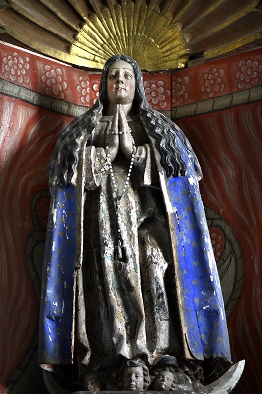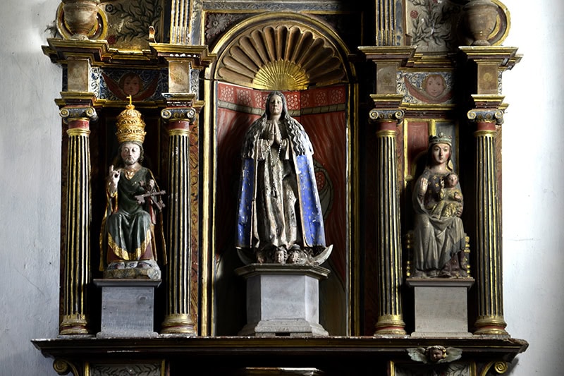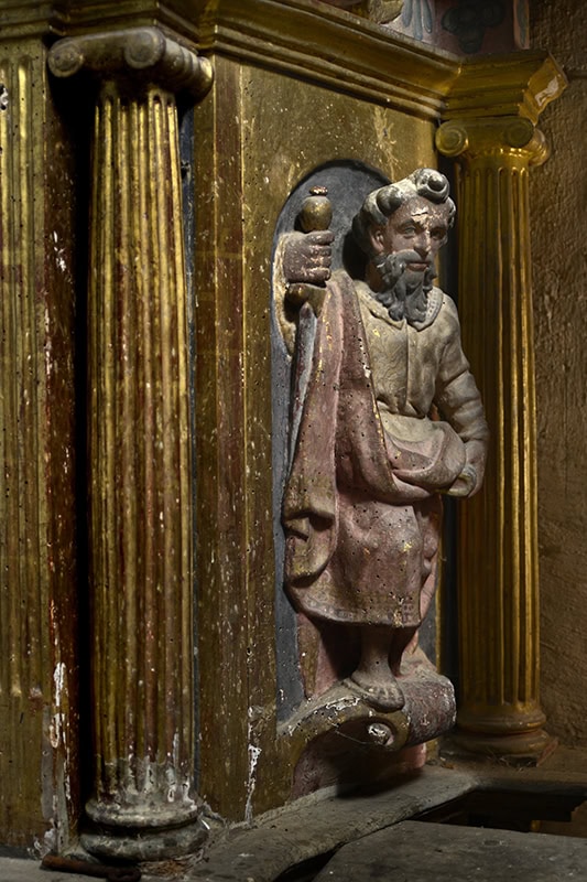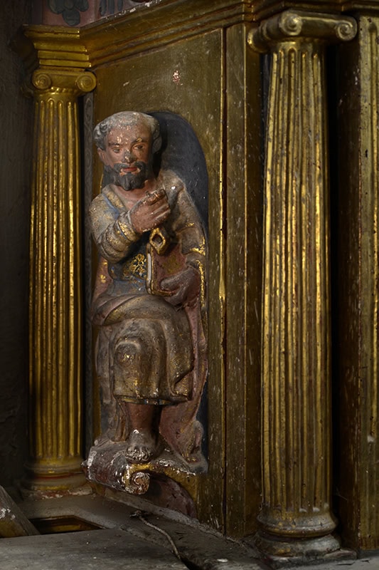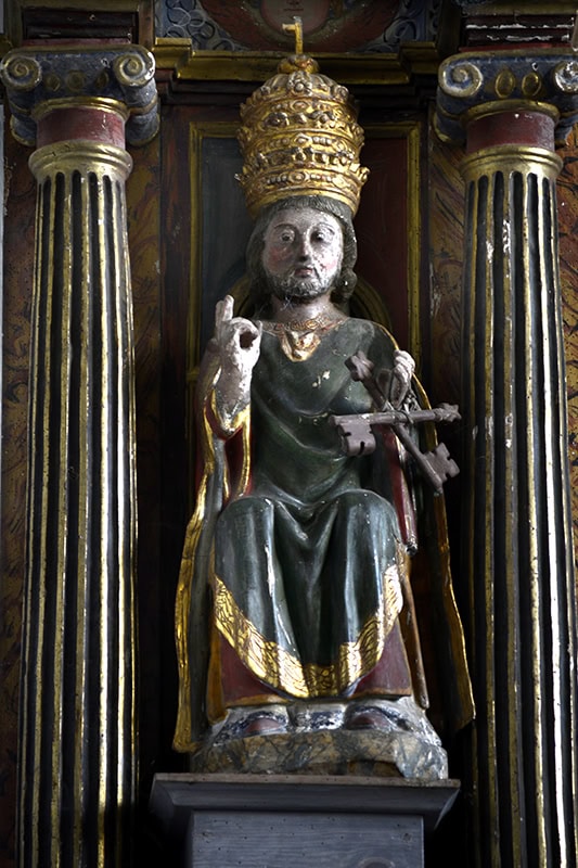 A la izquierda hay un San Pedro Papa [44] (86 x 28 x 19), está bendiciendo y se le han añadido unas torpes llaves. Figura interesante, algo hierática, de gesto seco y revestido con telas de plegados suaves en V entre las rodillas y describiendo pliegues blandos concéntricos por la parte del pecho. Gótica de mediados del siglo XIV. Por su cronología es de suponer que sea éste el San Pedro sobre el que en 1791 decía el visitador que “por su ridiculez y mala figura se deshaga, y sus pedazos se entierren en la citada iglesia”, orden que no sería atendida15AHEB-BEHA, Parroquias de San Lorenzo Mártir y Santa María de Orozko – Urigoiti – Zaloa, Cuentas y visitas 1726-1812, sign. 3004/004-00..