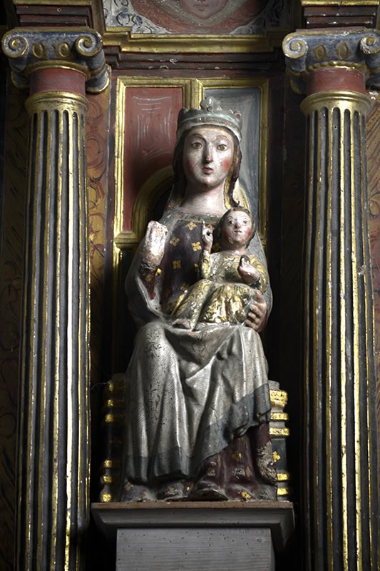 Al otro lado una Andra Mari (Virgen con el Niño) [45] (68 x 30 x 22) del mismo estilo y cronología. Aún de gesto distante, dirige su mirada al frente y el Niño se dispone sobre su izquierda, bendiciente. En este caso, las vestimentas de Madre e Hijo muestran un tipo de plegamiento de paños más minucioso que la talla anterior.