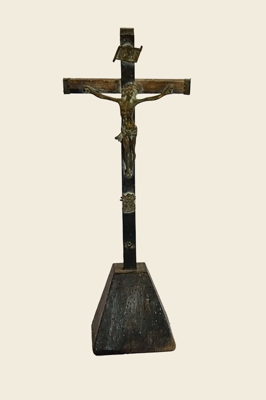 Cruz de altar [46] (37,5 x 14,5 x 8, Cristo 10,5 x 9,8 x 2). Cruz en madera parcialmente ebonizada con Cristo crucificado de bronce. Esta elevada sobre una base piramidal de superficie lisa y tiene sencillos brazos rectos, rematados en metal y adornados por placas de Inri en lo alto y de Dolorosa abajo. Obra neoclásica, del XIX.