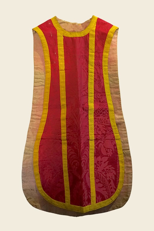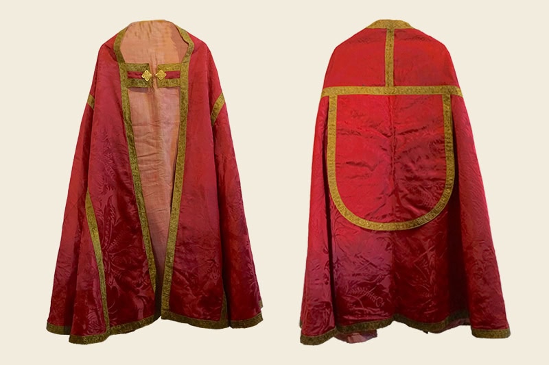 Juego de casulla [49] y capa pluvial [50] con dos estolas, dos manípulos, cubrecáliz y dos tapas de corporales. Confeccionados en damasco de palma carmesí, popular tejido usado desde el barroco pleno en adelante, a base de grandes hojas de palma, granadas y flores. Barroco, siglo XVIII.
