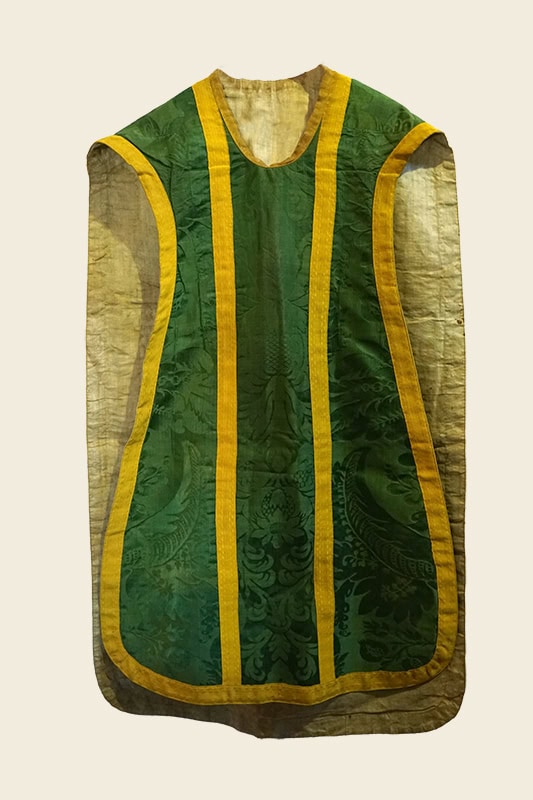 Casulla [51] con estola, tapa de corporales y cubrecáliz. Realizados en damasco de palma color verde. Barroco, siglo XVIII.