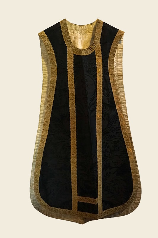 Casulla [52] con manípulo, cubrecáliz y tapa de corporales. En damasco de palma negro. Barroco, siglo XVIII