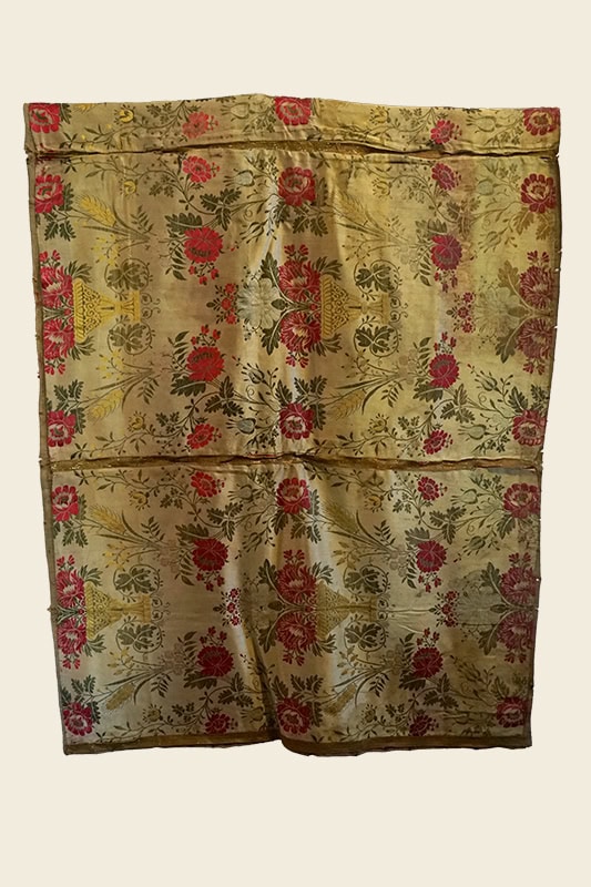 Frente de altar [53] (90 x 213). Distintos paramentos cosidos de tejido labrado en seda, color dorado salpicado de jarrones con flores junto a otras hojas, espigas y flores, en tonos verdes, amarillos y rojos. Barroco, finales del siglo XVIII.