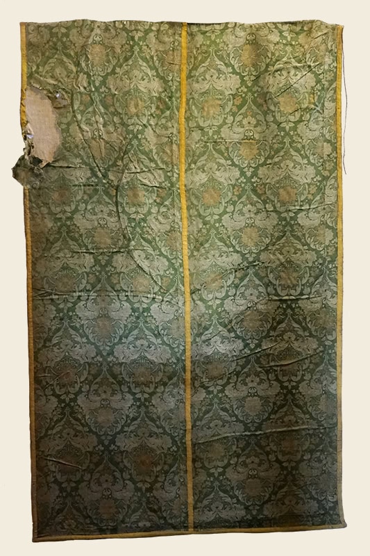 Telón para Monumento de Semana Santa [54] (185 x 117). Tejido de paramentos en tonos verdes y ocres, con diseño romboidal a modo de retícula para grumos vegetales con flor al centro y rejilla. Interesante no tanto por el textil, como por haber servido de telón para cubrir el sagrario durante la Semana Santa. Neoclásico, siglo XIX.
