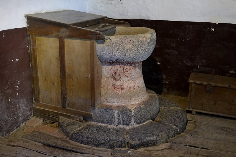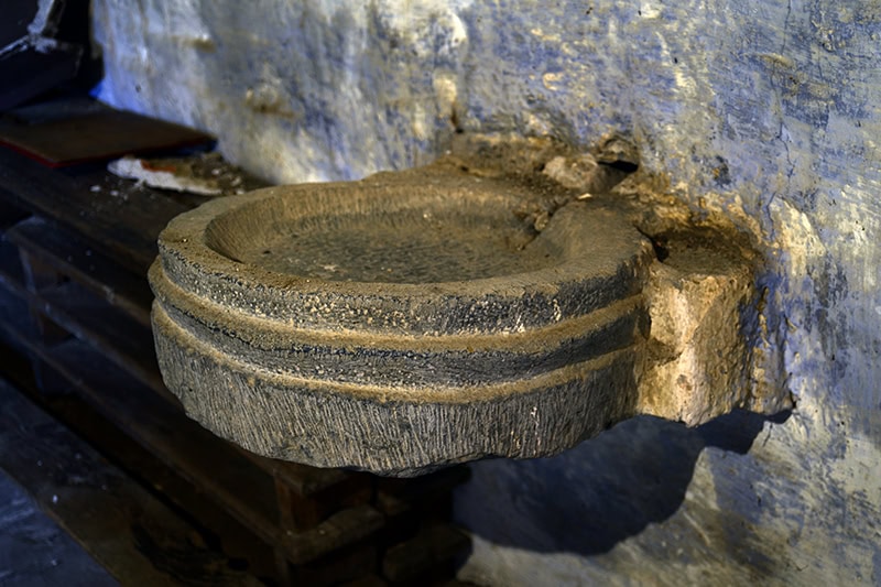 Pila bautismal [55] (78 x ø70). Piedra caliza. Copa semiesférica sobre un tosco pie cilíndrico y doble grada semicircular. Pieza muy popular, difícil de clasificar estilísticamente. Se encaja en un mueble de brazos avolutados, seguramente del siglo XIX.