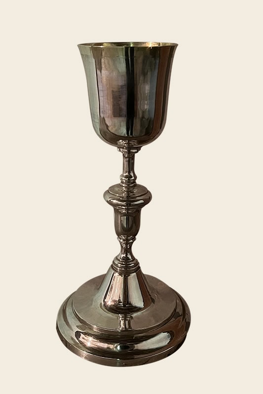 Cáliz [58] (24,6 x ø12,6 x ø7,3). Plata en su color. Liso, muy esbelto, con pie redondo, elevado astil con nudo en ánfora de toro bastante resuelto y copa cerrada. Lleva marcas de localidad (Vitoria), artífice (A/…GANDON…, Antolín Ruiz de Argandoña) y contraste (GARRIDO/64, Lorenzo Garrido). Pieza neoclásica de inercia, que como su marca indica fue realizada en 186419AHEB-BEHA, Parroquias de San Lorenzo Mártir y Santa María de Orozko – Urigoiti – Zaloa, Cuentas, inventarios y visitas 1813-1941. Signatura: 3006/002-00. Tiene patena (ø12,6) a juego.
