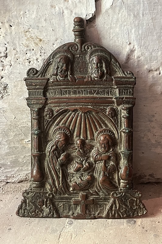Portapaz [59] (15,5 x 10,5 x 3,3). Bronce. Se trata de un modelo muy popular, del que hay numerosos ejemplares repartidos por distintos puntos del Señorío. Muestra la escena de la Natividad y el tímpano lo ocupan los santos patronos de la diócesis calagurritana, Emeterio y Celedonio. Renacentista, fue realizado en el taller de Juan Gutiérrez el Viejo, en Santo Domingo de La Calzada (La Rioja), entre 1540 y 157520BARRIO LOZA y VALVERDE PEÑA, p. 55. CILLA LÓPEZ, 2022, vol. 1, p. 235..